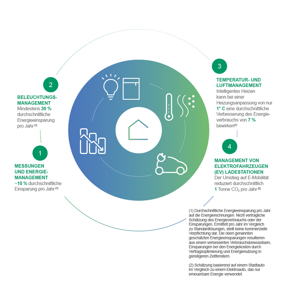 Die Legrand-Strategie zeigt vier unterschiedliche Bereiche auf, in denen Energieeinsparungen möglich sind. Kunden können dabei, je nach Produktsegment, ihren Verbrauch um bis zu 30 % reduzieren. Besonders die smarten Produkte von Legrand tragen durch ihre Vernetzung und Kommunikation zu einer Senkung des Ressourcenverbrauchs bei: Geräte, die erkennen, dass das Tageslicht heller wird, können automatisch die Beleuchtung reduzieren. Andere können bei zunehmender Temperatur die Heizung ausschalten.